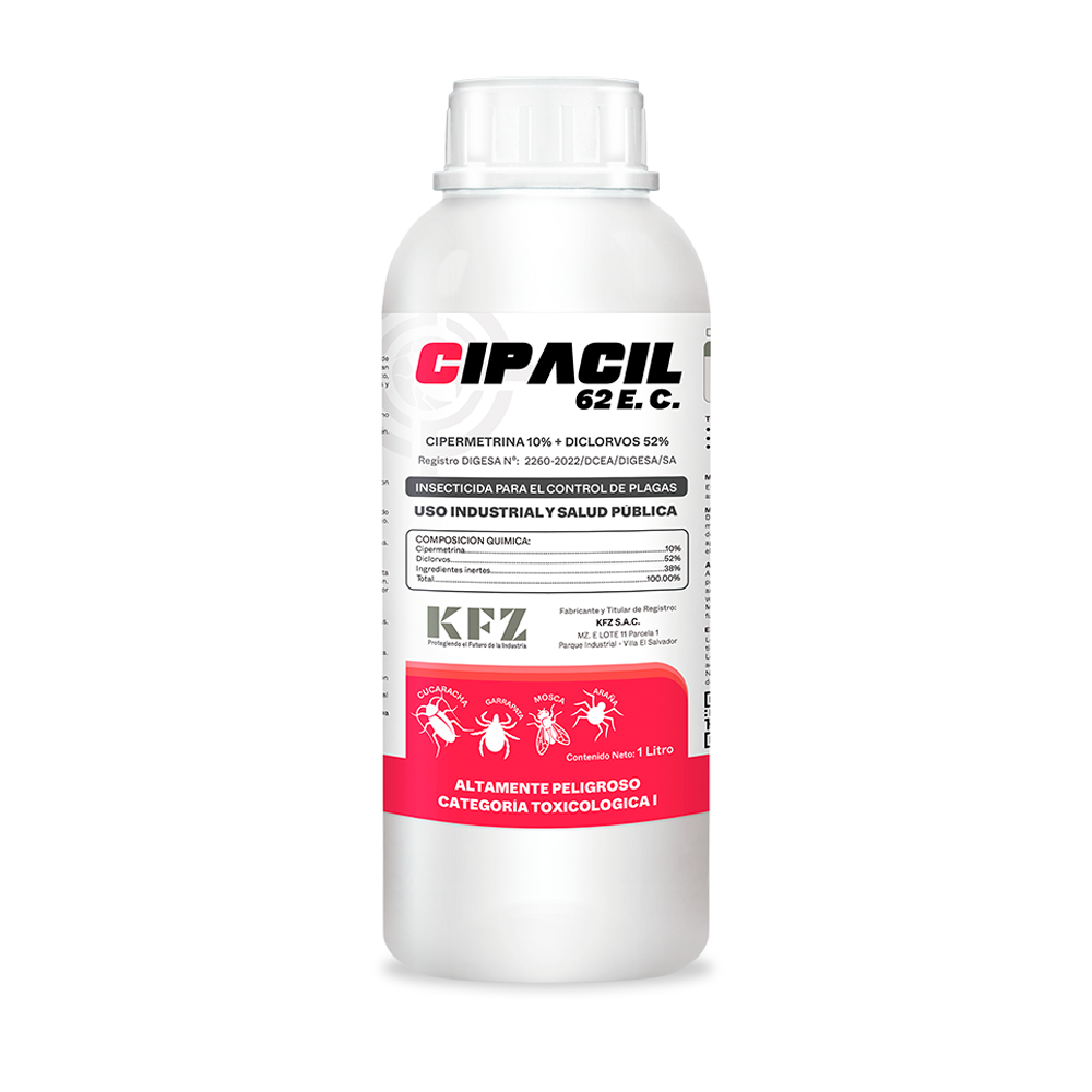 Está formulado, a base de un insecticida con rápido poder de acción sobre los insectos como es la Cipermetrina y de otro insecticida con gran poder de volteo como es Diclorvos. CIPACIL 62 C.E. actúa por contacto, ingestión e inhalación y es efectivo contra gran número de insectos rastreros y voladores.