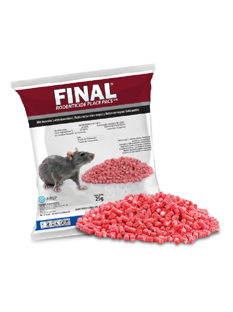 FINAL PELLETS es un rodenticida altamente atractivo y palatable formulado a partir de una amplia variedad de ingredientes de grado alimenticio lo que amplía la oferta nutricional, volviéndolo más aceptable por los roedores sinantrópicos.