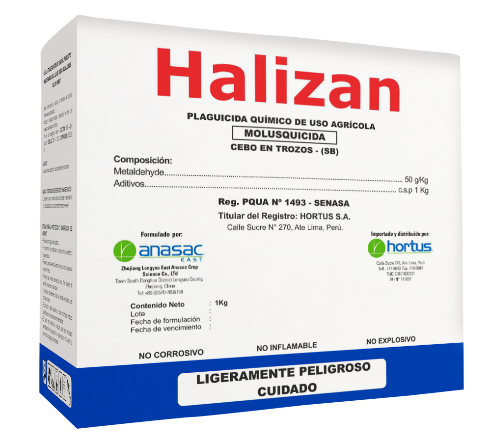 HALIZAN está formulado para el control de caracoles y babosas en jardines y cultivos susceptibles de su ataque. Es de baja toxicidad y biodegradable. Se usa de manera directa, no necesita disolverse. Su formulación proporciona seguridad durante el uso y da facilidad de manejo.