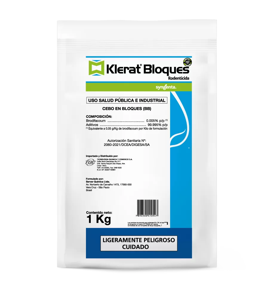 Rodenticida anticoagulante que elimina todo tipo de roedores con pequeñas dosis. Contiene BITREX, una sustancia extremadamente amarga percibida por los humanos pero no por los roedores, lo que brinda seguridad ante ingestas accidentales. Su antídoto es la Vitamina K1.