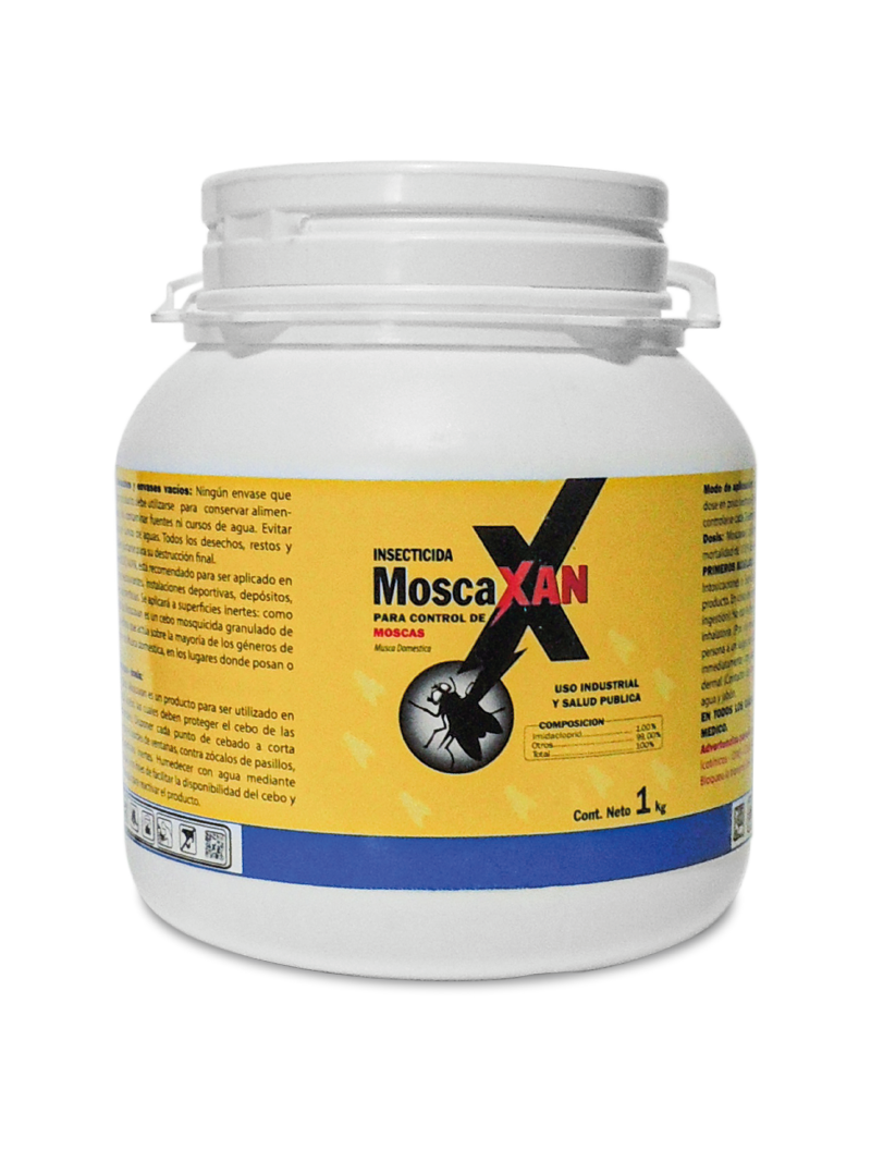 Moscaxan es un cebo mosquicida granulado de la familia Nitroguanidina que actúa sobre la mayoría de los géneros de moscas, especialmente Musca domestica, en los lugares donde posan o descansan.