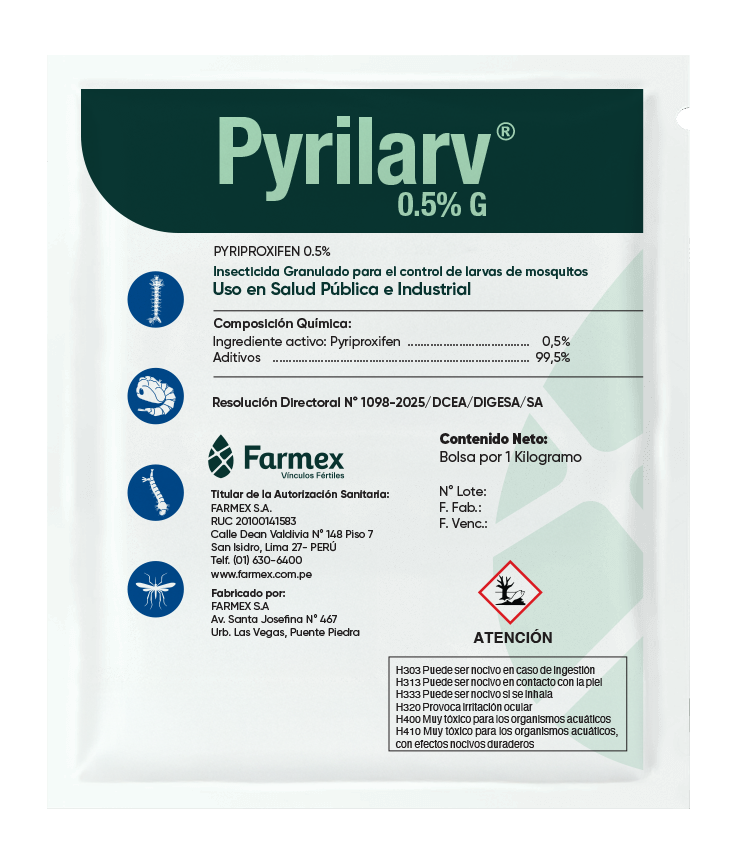 Insecticida de control efectivo contra larvas y pupas de insectos que se desarrollan en el agua y pueden transmitir enfermedades.