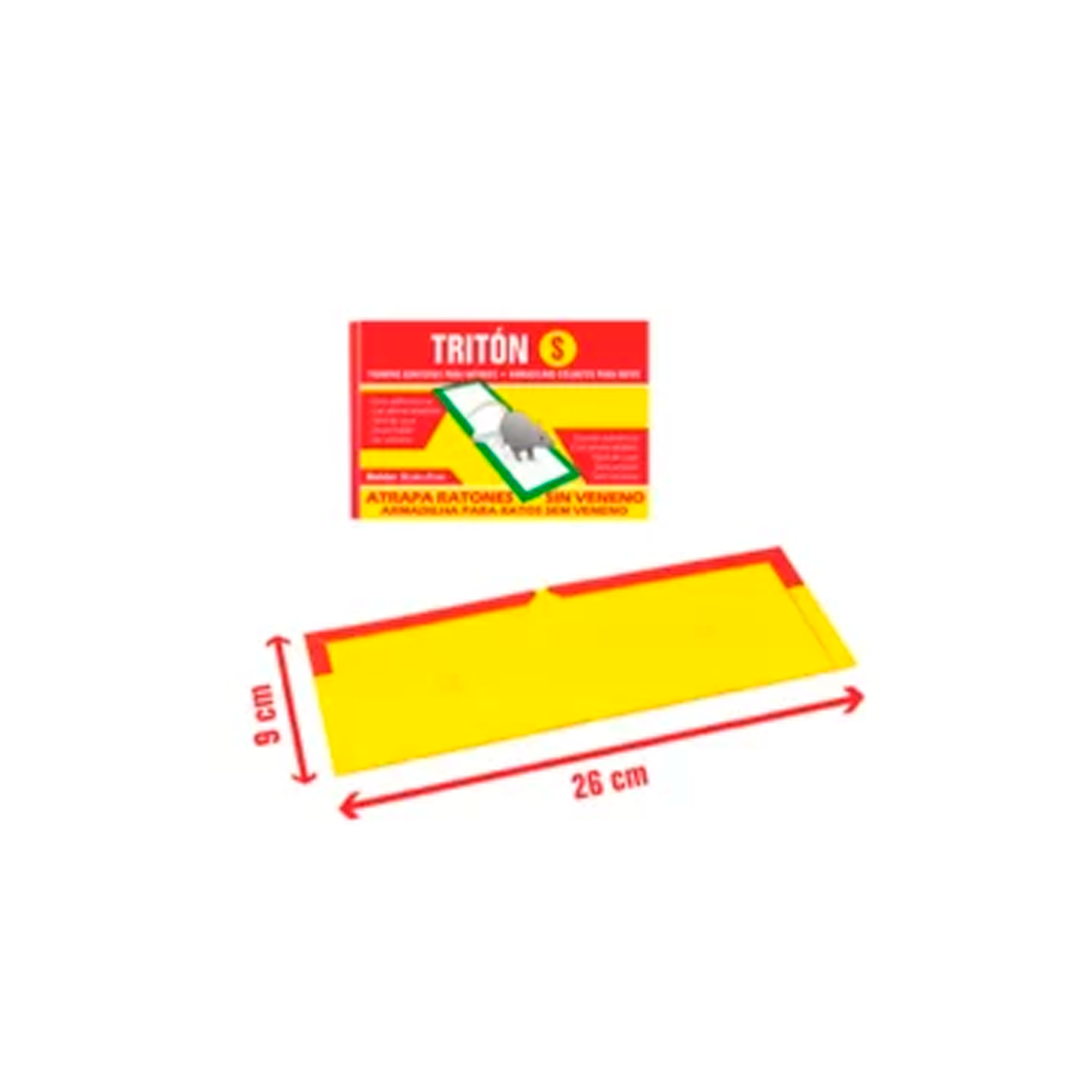 La trampa TRITÓN posee un alto poder adhesivo que atrapa ratas y ratones, gracias a una cola transparente y muy potente, ubicada sobre sobre unas dos placas grandes rectangular plano de cartón grueso plastificado.